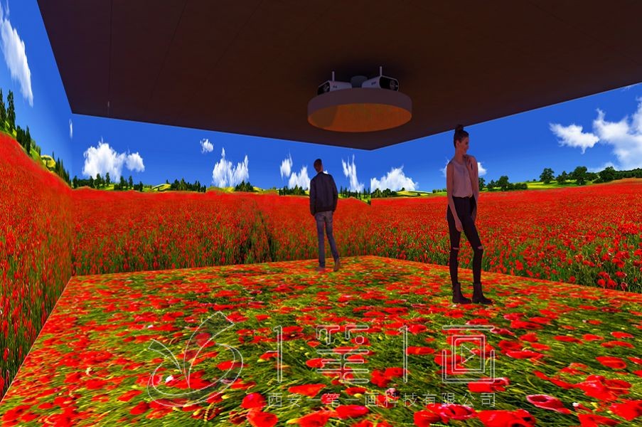 不同區(qū)域之間通過(guò)過(guò)渡場(chǎng)景進(jìn)行連接,如設(shè)置一個(gè)模擬河流生態(tài)系統(tǒng)的地面投影,當(dāng)參觀者走過(guò)時(shí),水中的虛擬生物會(huì)響應(yīng)并游動(dòng),增強(qiáng)參觀者的參與感和沉浸感。
